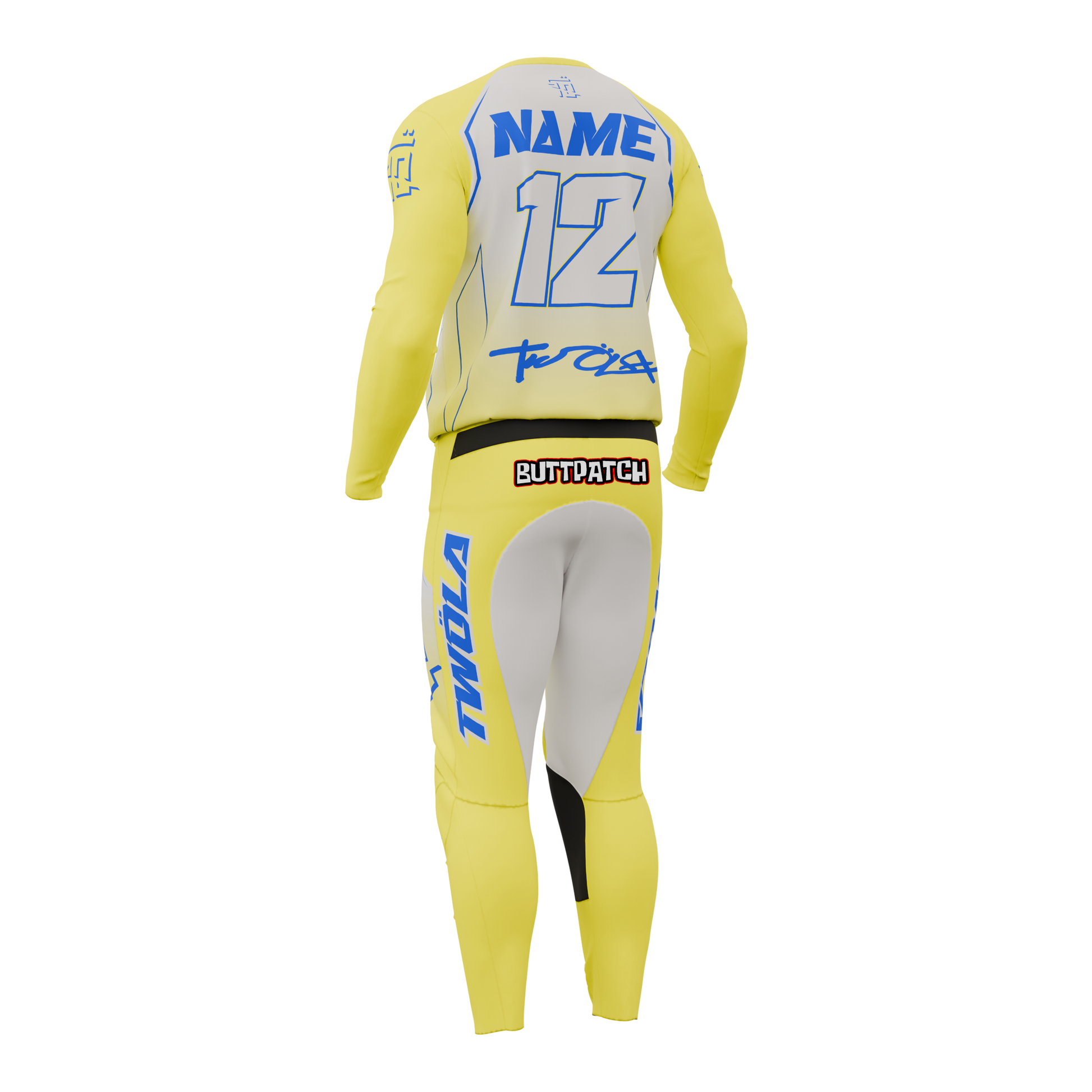 Votre nom, votre numéro et vos logos de sponsors peuvent être ajoutés sur demande. Chaque tenue est créée sur mesure pour refléter votre identité.
